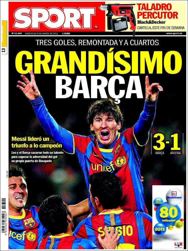 SPORT BARCELLONA – Anche l’altro quotidiano catalano Sport elogia il grande Barcellona e soprattutto Lionel Messi.
