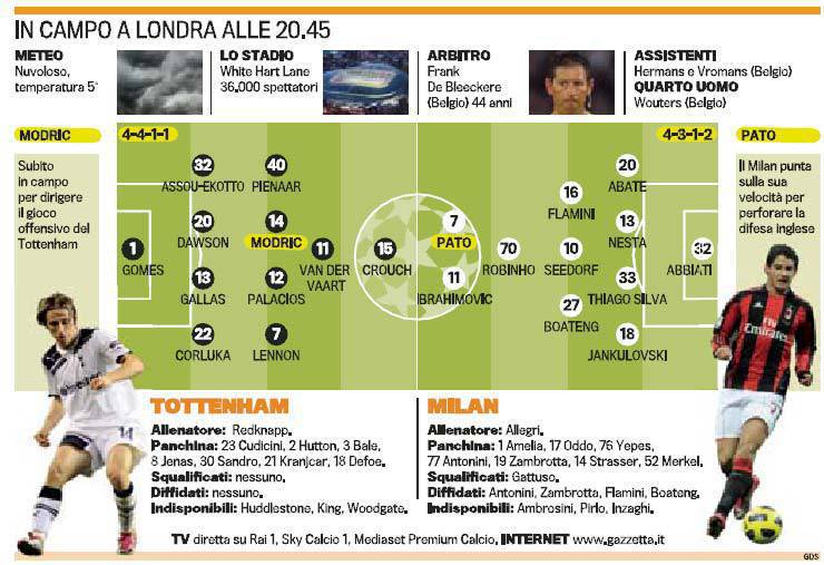 CHAMPIONS LEAGUE TOTTENHAM-MILA ULTIME PROBABILI FORMAZIONI / Questa sera h 20:45 il Milan si gioca una fetta importante di stagione, nella partita che sancirà il passaggio del turno di Champions League. Rossoneri chiamati alla vittoria dopo il deludente risultato dell’andata, quando per il goal di Crouch uscirono sconfitti da un match finito nel peggiore dei modi, con la perdita del controllo di Gattuso e susseguente rissa con Joe Jordan. Tecnico Allegri che scenderà in campo con il 4-3-1-2, coppia d’attacco Ibrahimovic–Pato, con Robinho schierato come trequartista. Centrocampo muscolare con l’esperienza di Seedorf al centro, il rientrante Boateng (recuperato dopo l’infortunio contro la Juventus) e Mathieu Flamini. Difesa titolare con la coppia di centrali Thiago Silva–Nesta, Abate e Jankulovski esterni della retroguardia. Abbiati tra i pali. Per Redknapp dubbio sullo schieramento o meno di Bale dal primo minuto. Di seguito la foto con entrambi gli schieramenti secondo La Gazzetta Sportiva.