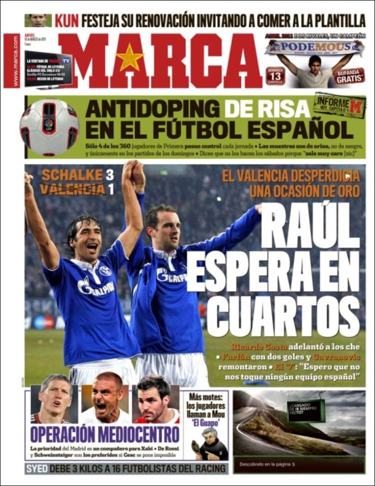 MARCA RAUL SCHALKE – Sul quotidiano spagnolo Marca si parla della vittoria dello Schalke per tre a uno sul campo del Valencia. I tedeschi volano ai quarti di Champions.