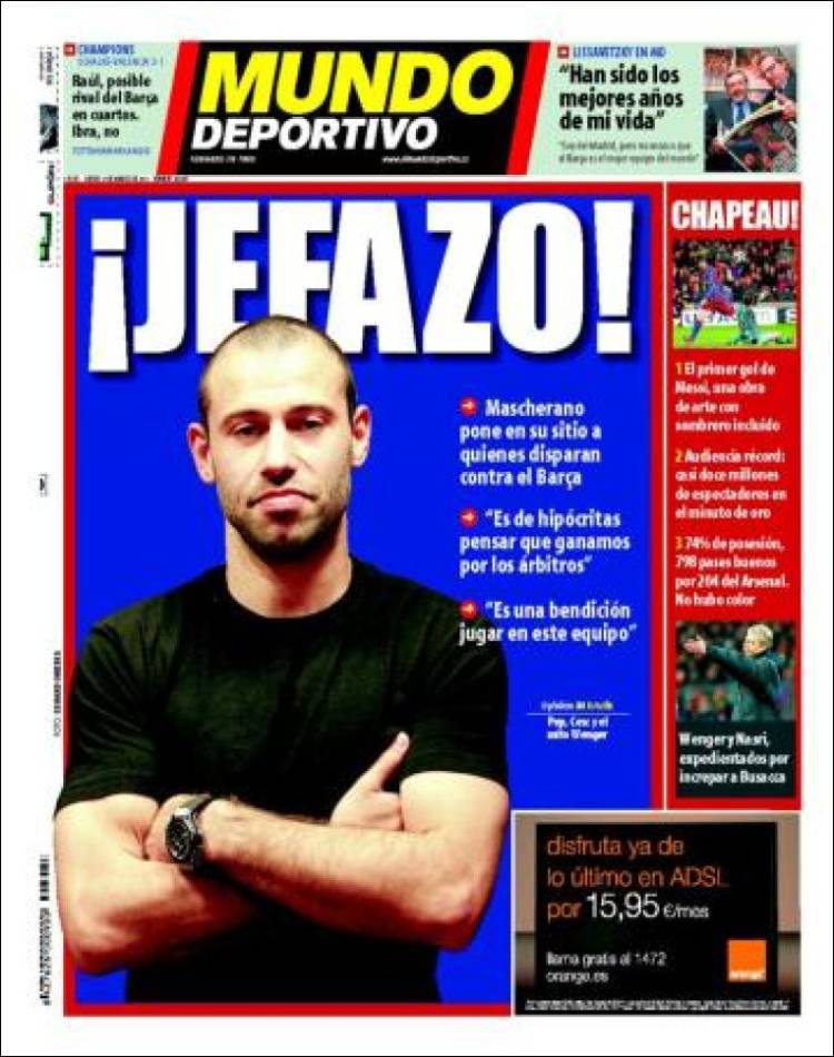 MUNDO DEPORTIVO MASCHERANO – Sul quotidiano catalano Mundo Deportivo si parla di Mascherano, che sul proprio sito internet ha difeso il Barcellona dalle critiche ricevute dai giocatori dell’Arsenal.