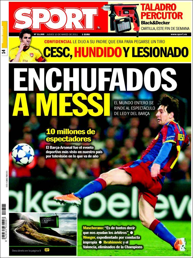 SPORT MESSI – Sull’altro quotidiano catalano Sport si parla di Messi, con dieci milioni di spettatori che hanno visto la prodezza dell’argentino contro l’Arsenal.