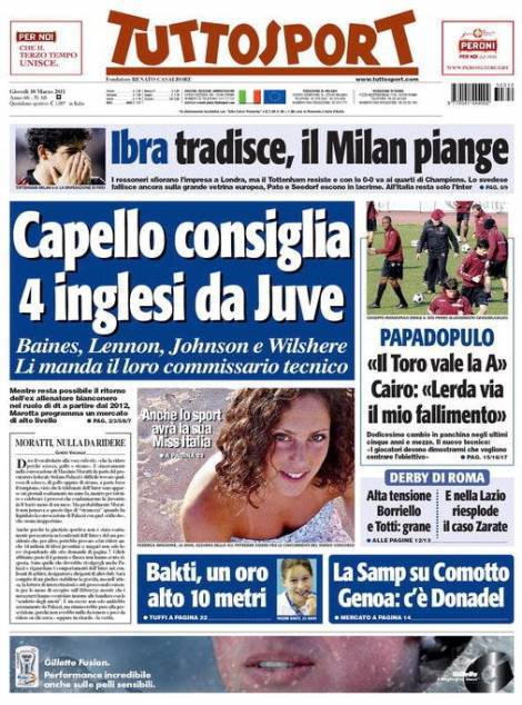 TUTTOSPORT CAPELLO JUVENTUS – Su Tuttosport si parla del calciomercato Juventus con il c.t. dell’Inghilterra Capello che consiglia quattro giocatori ai bianconeri.