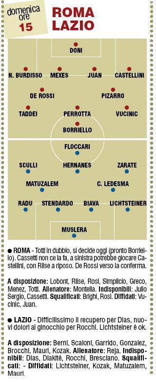 FANTACALCIO ROMA LAZIO PROBABILI FORMAZIONI – Domenica pomeriggio derby romano tra Roma e Lazio. Nei giallorossi Totti dovrebbe partire dalla panchina, nella Lazio Floccari titolare. Ecco le formazioni secondo il Corriere dello Sport.