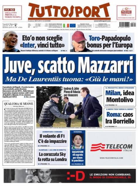RASSEGNA STAMPA PRIMA PAGINA TUTTOSPORT ALLENATORE MAZZARRI NAPOLI DE LAURENTIIS- Tuttosport apre il suo numero odierno con la notizia che la Juve avrebbe effettuato uno “scatto” per accordarsi con Mazzarri in vista della prossima stagione. De Laurentiis, però, non sembra intenzionato a privarsi del suo allenatore.