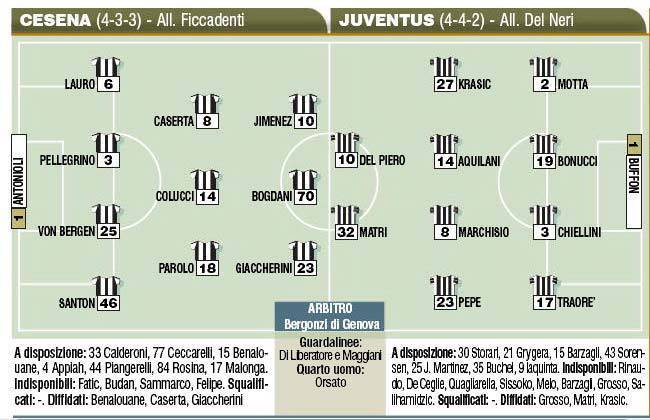 FANTACALCIO SERIE A PROBABILI FORMAZIONI CESENA JUVENTUS- Di seguito, in foto, le probabili formazioni di Cesena-Juventus secondo il Corriere dello Sport, anticipo di Serie A che si giocherà oggi alle 20,45. Nella Juve Del Piero tornerà a giocare titolare, mentre Chiellini riprederà la sua posizione naturale, quella di centrale di difesa, lasciando il ruolo di terzino sinistro a Traorè.