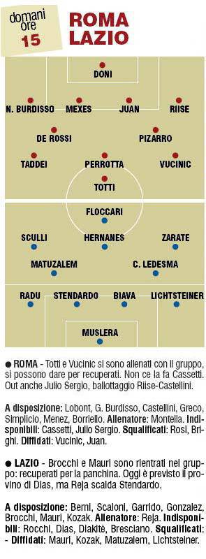 FANTACALCIO SERIE A PROBABILI FORMAZIONI ROMA LAZIO DERBY INFORTUNATI RECUPERATI- Secondo il Corriere dello Sport la Roma recupererà, in vista della derby di domani con la Lazio, Totti e Vucinic, mentre rimane indisponibile Julio Sergio. La Lazio recupera, ma solo per la panchina, Brocchi e Mauri, mentre rimane improbabile il recupero di Dias, che sarà dunque sostituito da Stendardo. Di seguito le formazioni in foto.