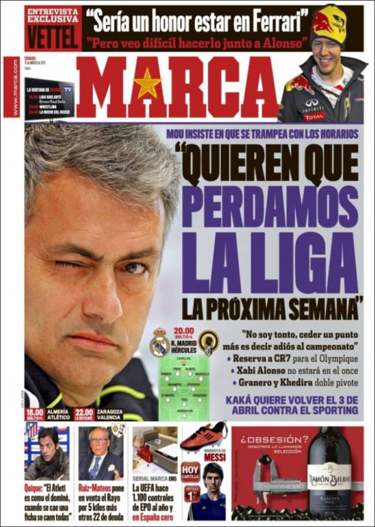 MARCA MOURINHO REAL MADRID – Sul quotidiano spagnolo Marca si parla dell’ennesima polemica di Mourinho che si è lamentato dei giorni di riposo concessi al Barcellona, maggiori rispetto a quelli del Real Madrid.