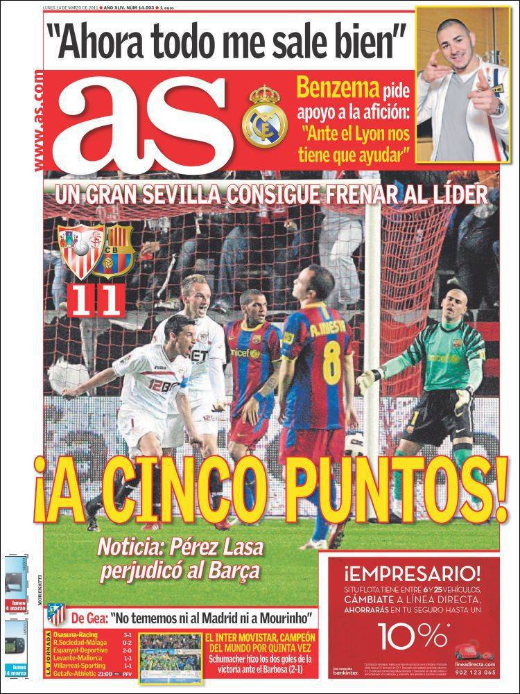 AS BARCELLONA REAL MADRID – Anche il quotidiano madrileno As parla dei cinque punti di distacco del Real Madrid sul Barcellona dopo il pareggio dei catalani sul campo del Siviglia.
