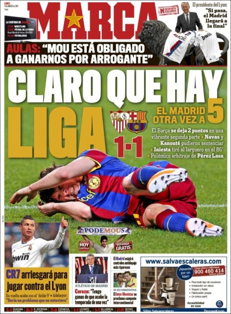 MARCA LIGA BARCELLONA – Sul quotidiano Marca si parla del pareggio del Barcellona sul campo del Siviglia. Ora il Real Madrid è distante solo cinque punti.