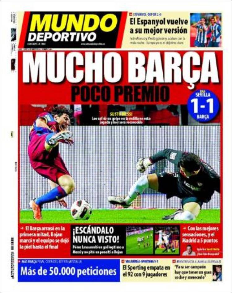 MUNDO DEPORTIVO BARCELLONA – Sul quotidiano El Mundo Deportivo viene sottolineata la bella prova del Barcellona sul campo del Siviglia ma i catalani riescono a raccogliere solo un punto.