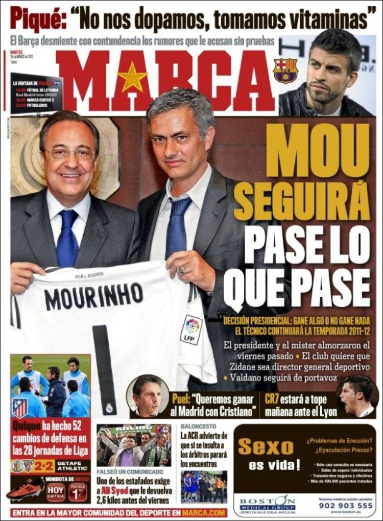 MARCA MOURINHO REAL MADRID – Il quotidiano spagnolo Marca parla del rapporto tra Mourinho e il Real Madrid che continuerà nella prossima stagione anche in caso di sconfitta in Champions e in campionato.