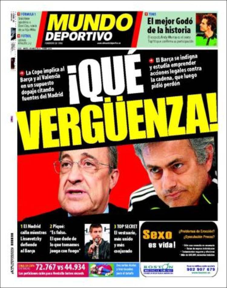 MUNDO DEPORTIVO BARCELLONA VERGOGNA – Sul quotidiano catalano Mundo Deportivo si parla delle accuse di doping del Real Madrid a Barcellona e Valencia.