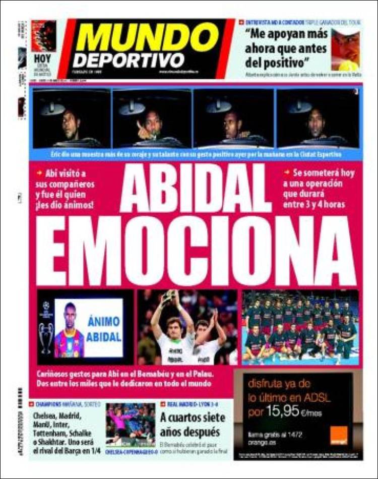 MUNDO DEPORTIVO ABIDAL – Il dramma di Abidal, terzino del Barcellona che verrà operato al fegato per un tumore. Ieri anche il Real Madrid ha mandato un messaggio di incoraggiamento al rivale.