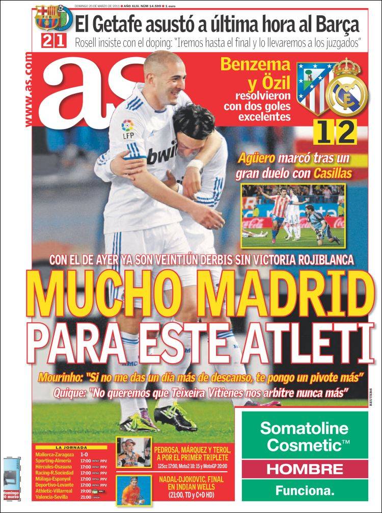 AS REAL MADRID ATLETICO – Anche il quotidiano As lo attesta: troppo più forte il Real per questo Atletico Madrid. Bastano Benzema ed Ozil per risolvere il derby con i cugini Colchoneros, e adesso si attende il Clasico.