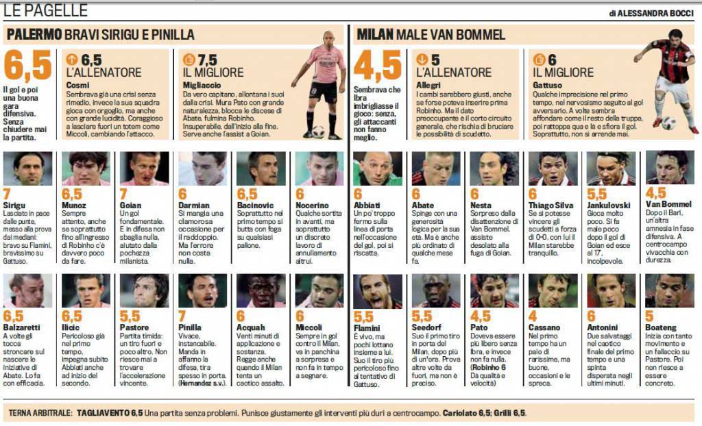 FANTACALCIO PALERMO MILAN VOTI PAGELLE GAZZETTA DELLO SPORT – Per voi amanti del fantacalcio, le pagelle della Gazzetta dello Sport per la partita Palermo-Milan, conclusasi con il risultato di 1-0. Ottima prova corale per il Palermo che ha una pecca solo nel suo gioiellino Pastore; bocciato invece il Milan che non è riuscito a rimettere la partita in carreggiata.