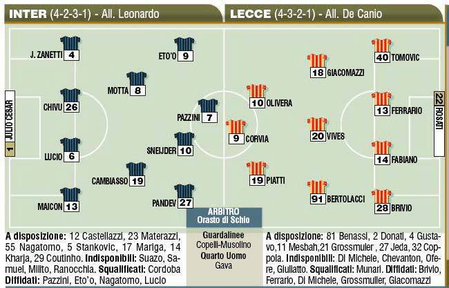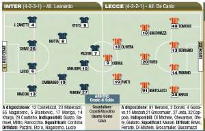 CALCIO SERIE A FORMAZIONI FANTACALCIO INTER LECCE- Ecco le probabili formazioni, in foto, di Inter e Lecce, che si affronteranno oggi alle 15.00 a San Siro. Secondo il Corriere dello Sport, Ranocchia è ancora indisponibile e lascerà dunque il posto a Chivu. Zanetti giocherà dunque come terzino sinistro e Motta partirà da titolare davanti alla difesa. Nel Lecce pesa l’assenza di Di Michele, che sarà rimpiazzato da Piatti.