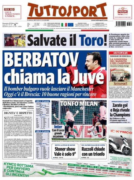 TUTTOSPORT BERBATOV JUVENTUS – Prima pagina del quotidiano Torinese Tuttosport, dedicata al possibile obiettivo di mercato della Juventus Dimitar Berbatov. Il giocatore ha ieri deciso la partita per il suo Manchester United, regalando alla sua squadra una buona parte di titolo. Secondo Tuttosport ci sarebbero i presupposti per far arrivare l’attaccante Bulgaro a Torino.