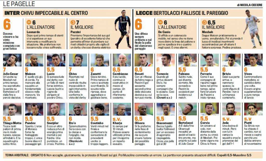 FANTACALCIO INTER LECCE VOTI PAGELLE GAZZETTA – Un gol di Pazzini, il sesto in dieci presenze con la maglia dell’Inter, permette alla formazione di Leonardo di battere il Lecce e di volare a meno due dal Milan capolista e tra due settimane ci sarà il derby. Bene il Lecce, la compagine di De Canio non ha sfigurato, Bertolacci è andato vicino al gol ma ha trovato un grande Julio Cesar. I voti della Gazzetta dello Sport.