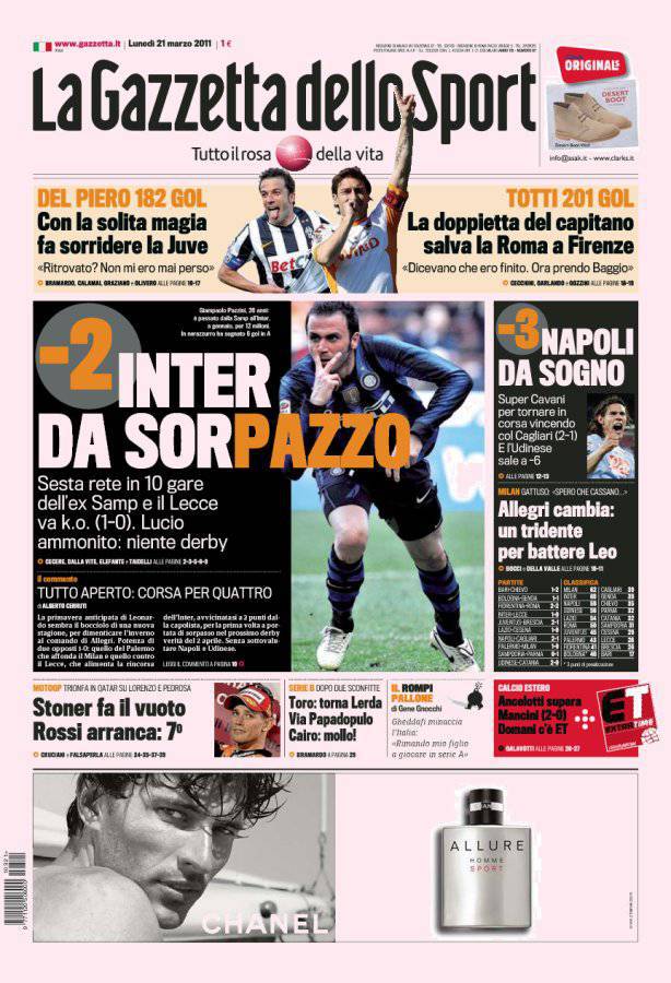 GAZZETTA INTER PAZZINI – Sulla Gazzetta dello Sport si parla della vittoria dell’Inter contro il Lecce firmata da Pazzini. Nerazzurri a meno due dal Milan.