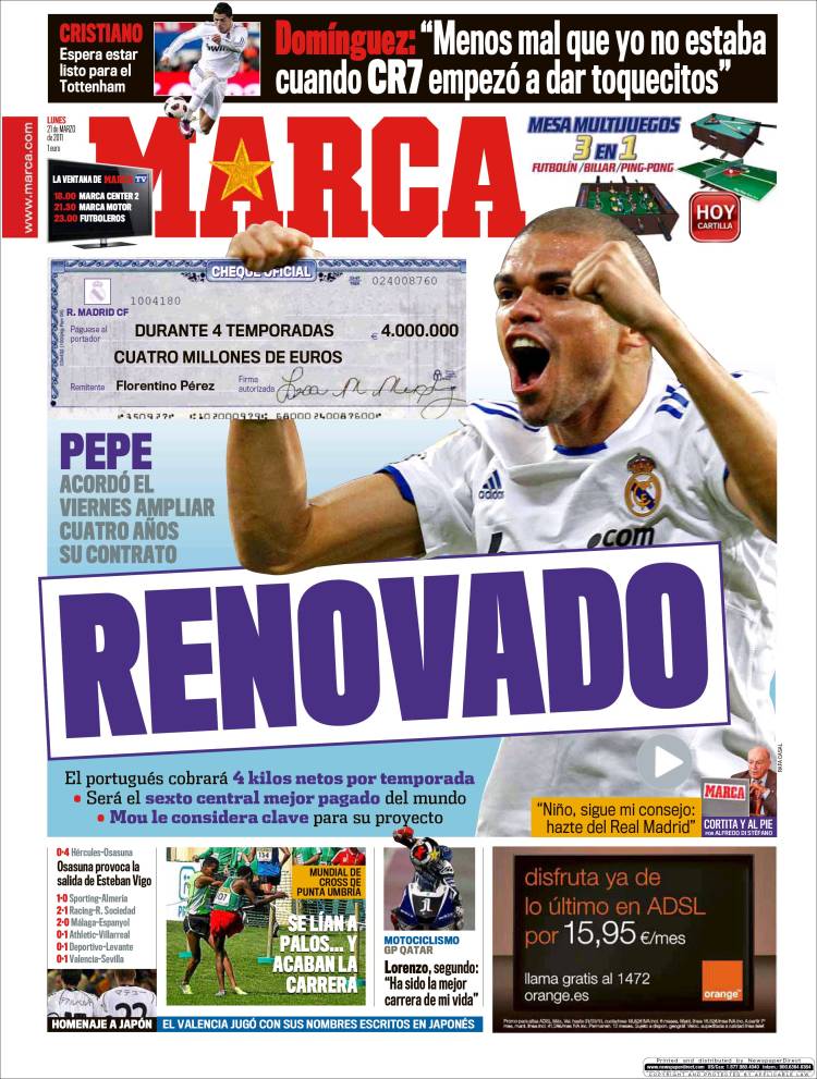 MARCA PEPE REAL MADRID – Sul quotidiano Marca si parla del rinnovo del contratto di Pepe, difensore portoghese del Real Madrid che era in scadenza di contratto nel 2012.