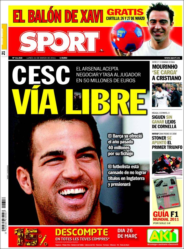 SPORT BARCELLONA FABREGAS – Sull’altro quotidiano catalano Sport si parla del mercato del Barcellona con il possibile acquisto di Fabregas nella prossima stagione.