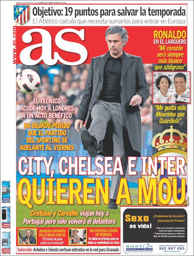 AS CITY CHELSEA INTER MOURINHO – Sul quotidiano spagnolo As si parla del futuro di Mourinho con City, Chelsea e Inter che vorrebbero il tecnico del Real Madrid.
