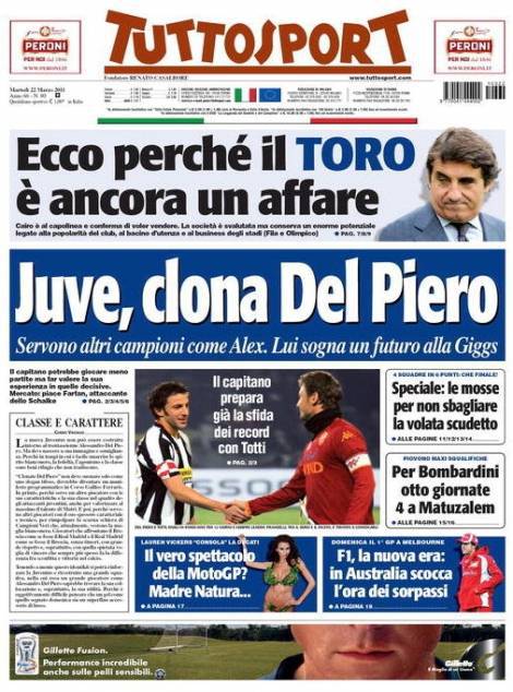 TUTTOSPORT JUVENTUS DEL PIERO – Sul quotidiano Tuttosport si parla di Del Piero che è sempre più protagonista nella Juventus.