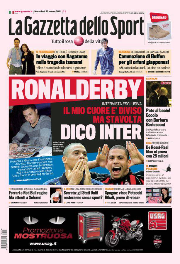 GAZZETTA RONALDO INTER DERBY – Sulla Gazzetta dello Sport intervista esclusiva al Fenomeno Ronaldo, che si è ritirato pochi mesi fa. Il brasiliano ha parlato del derby indicando l’Inter come favorita.
