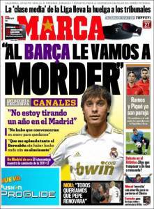 RASSEGNA STAMPA ESTERA MARCA CANALES INTERVISTA- Il giornale madrileno Marca riporta oggi in prima pagina, l’intervista di Canales, che ha affermato, riguardo il Barcellona: “Al Barca le vamos a morder”, volendo intendere che il Real Madrid raggiungerà presto in classifica l’attuale capolista.