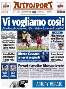RASSEGNA STAMPA TUTTOSPORT JUVENTUS TORINO BENEFICENZA- Nella sua prima pagina di oggi Tuttosport tratta della partita di beneficenza che ha visto di fronte Juventus e Torino con i loro campioni storici. L’invito alle due società è di comprarne di nuovi per fare sognare ancora le rispettive tifoserie.