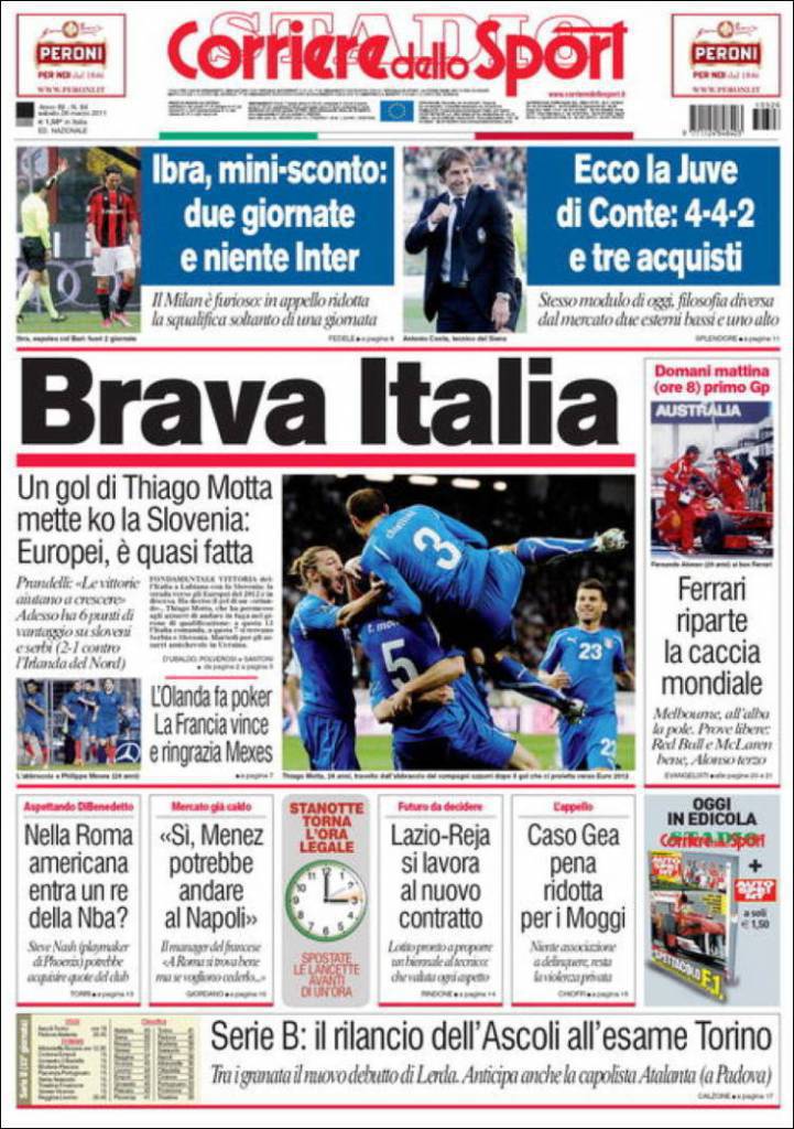 RASSEGNA STAMPA CORRIERE DELLO SPORT ITALIA SLOVENIA QUALIFICAZIONI EUROPEI- Il Corriere dello sport tratta oggi nella sua prima pagina la vittoria della nazionale italiana su quella slovena, vittoria che avvicina molto la squadra di Prandelli alla qualificazione ai prossimi Europei.