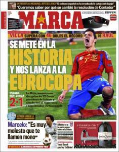 RASSEGNA STAMPA ESTERA MARCA SPAGNA QUALIFICAZIONI EUROPEI- Il quotidiano spagnolo Marca apre il suo numero di oggi trattando della vittoria della Spagna sulla Repubblica Ceca. Grande protagonista David Villa, che ha superato come numero di gol in nazionale Raul. La partita è terminata sul punteggio di 2 a 1.
