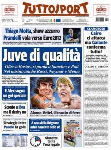 RASSEGNA STAMPA TUTTOSPORT PRIMA PAGINA JUVENTUS CALCIOMERCATO- Nella sua prima pagina, il giornale sportivo Tuttosport riporta gli ultimi aggiornamenti di calciomercato riguardo la Juventus, sottolineando come tutti i possibili innesti siano giocatori di qualità.