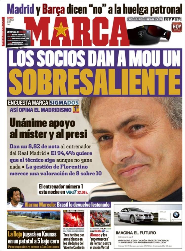 MARCA INCHIESTA MOURINHO – La rivista spagnola Marca, apre con un’inchiesta dedicata a Josè Mourinho. Marca ha chiesto ai tifosi Madrileni quanto fossero legati a presidente ed allenatore. Risultato: un plebiscito per Perez e Mou.