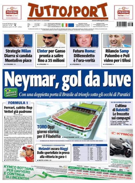 TUTTOSPORT NEYMAR JUVENTUS – Anche Tuttosport parla di Neymar, talento brasiliano del Santos ieri autore di una doppietta nel match tra Brasile e Scozia.