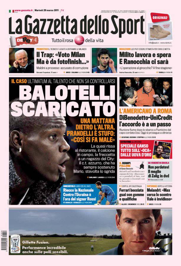 BALOTELLI GAZZETTA PRANDELLI – Sulla Gazzetta dello Sport si parla di Mario Balotelli, talento del City scaricato dal c.t. dell’Italia Prandelli.