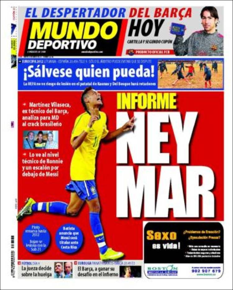 MUNDO DEPORTIVO BARCELLONA NEYMAR – Sul quotidiano catalano Mundo Deportivo si parla di Neymar, talento brasiliano del Santos che piace al Barcellona.