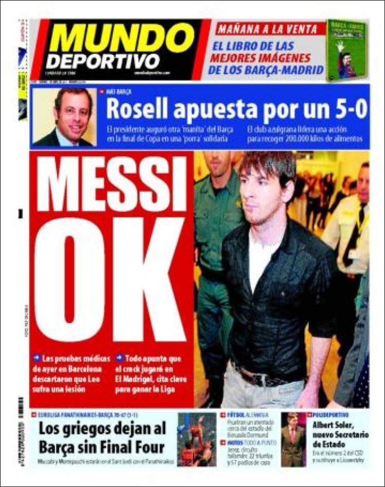 RASSEGNA STAMPA ESTERA MUNDO DEPORTIVO MESSI INFORTUNIO- Mundo Deportivo dedica oggi la sua notizia di apertura a Leo Messi, per il quale si temeva un lungo stop e che invece sembra aver smaltito i problemi fisici che tanto hanno preoccupato i tifosi e lo staff del Barcellona.