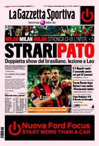 GAZZETTA DELLO SPORT STRARIPATO – Prima pagina della Gazzetta dello Sport interamente dedicata alla vittoria del Milan nel derby di Milano. Protagonista assoluto Alexandre Pato che ha siglato una doppietta che ha mandato al tappeto i cugini.