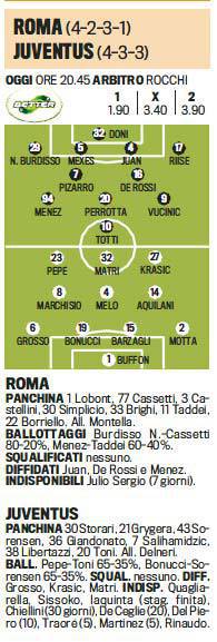 ROMA JUVENTUS PROBABILI FORMAZIONI GAZZETTA DELLO SPORT FOTO – Il Big Match di questa sera è indubbiamente Roma Juventus, partita che potrebbe decidere il destino europeo delle due squadre. La Gazzetta dello Sport mette in campo un 4-2-3-1 per la Roma con Francesco Totti unica punta. Delneri invece si butta sul 4-3-3 recuperando quelli che sono gli acciaccati Marchisio e Bonucci, che alle 20.45 saranno regolarmente in campo.