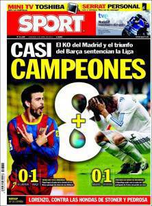 SPORT – Anche sulla prima pagina del quotidiano Sport campeggia il numero 8, numero che segna i punti di distacco tra Real Madrid e Barça dopo la vittoria degli azulgrana di ieri e la contemporanea sconfitta dei galacticos in casa.