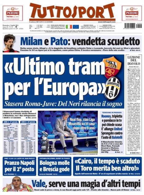TUTTOSPORT – Il quotidiano Torinese Tuttosport, si concentra sulla partitissima di questa sera tra Roma e Juventus. Gigi Delneri ha parlato della partita come dell’ “ultimo tram per l’europa”, titolo poi sfruttato proprio da Tuttosport.