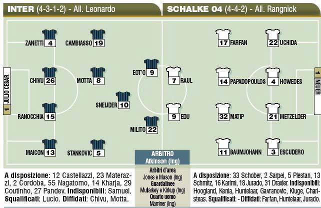 INTER SCHALKE PROBABILI FORMAZIONI FOTO – Questa sera l’Inter sarà impegnata nell’andata dei quarti di finale contro lo Schalke in Champions League. I nerazzurri cercheranno di chiudere il discorso qualificazione all’andata. Ecco le probabili formazioni secondo il Corriere dello Sport. Torna Milito.