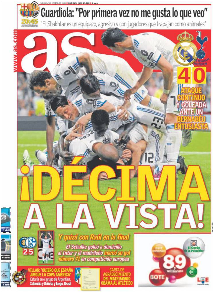 AS REAL MADRID – Il quotidiano As proietta il Real Madrid in finale di Champions League dopo il quattro a zero rifilato al Tottenham nell’andata dei quarti di finale.