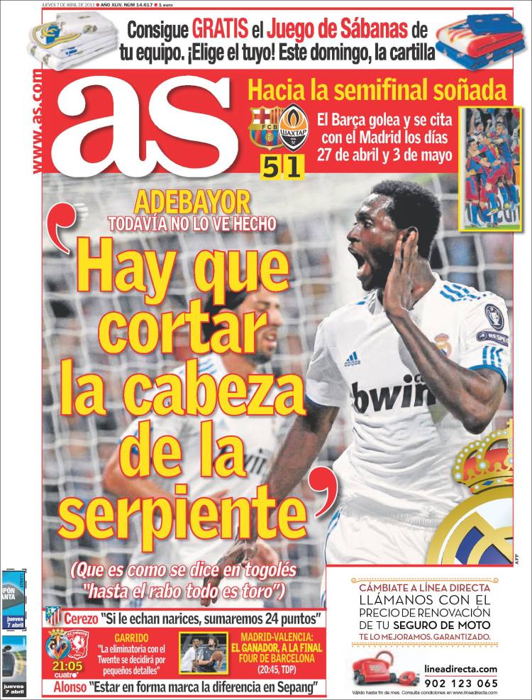 AS REAL MADRID BARCELLONA – Anche l’altro quotidiano madrileno As parla dell’ormai certa semifinale di Champions League tra Real Madrid e Barcellona.