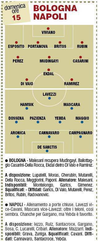 FANTACALCIO BOLOGNA NAPOLI PROBABILI FORMAZIONI – Sul Corriere dello Sport spazio alle formazioni di Bologna e Napoli. Negli azzurri mancherà il bomber Cavani che verrà sostituito da Mascara. Nel Bologna c’è sempre l’agguerrito Di Vaio. Ecco le formazioni.