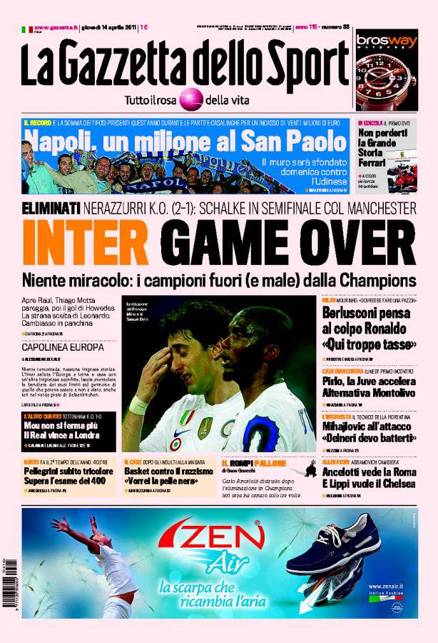INTER CHAMPIONS – Sulla Gazzetta dello Sport si parla della sconfitta dell’Inter contro lo Schalke per due a uno che mette fine al cammino in Champions dei nerazzurri.