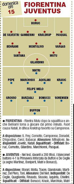 FIORENTINA JUVENTUS PROBABILI FORMAZIONI – Fiorentina e Juventus è il grande match di domenica pomeriggio. Una sfida classica che è molto sentita dai tifosi. Delneri punta nuovamente sul modulo con Matri unica punta, chiedendo a Krasic di stare più vicino possibile al bomber bianconero. Nella Fiorentina torna Mutu. Le probabili formazioni secondo il Corriere dello Sport.