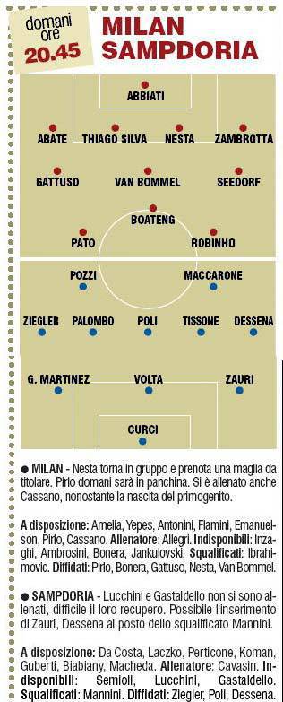 FANTACALCIO MILAN SAMPDORIA PROBABILI FORMAZIONI – Il Milan domani sera affronterà in casa la Sampdoria per cercare di allungare il proprio vantaggio su Napoli e Inter. I rossoneri punteranno sulla coppia d’attacco formata da Pato e Robinho. Ecco le probabili formazioni secondo il Corriere dello Sport.