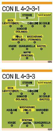 CALCIOMERCATO JUVENTUS BENZEMA PIRLO BASTOS – La Juventus prepara le strategie per il mercato estivo. I dirigenti bianconeri rivoluzioneranno la squadra in ogni reparto cercando di portare a Torino giocatori di grande spessore. Ovviamente tutto dipenderà dalla qualificazione o meno in Champions League, traguardo indispensabile per portare alla Juventus campioni come Mascherano e Benzema. In difesa piace molto Rolando del Porto, Beck dell’Hoffenheim e Fucile sempre della formazione portoghese. A centrocampo i sogni di Marotta sono Pirlo e Mascherano mentre in attacco si cercherà di fare degli sforzi importanti per Benzema. Ecco le due squadre che ha in mente Marotta secondo la Gazzetta dello Sport.